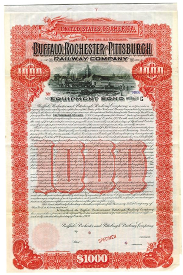 New York & Pennsylvania. $1000 Specimen 4% Series G Equipment Coupon Bond, Black print on large red border and under tint, Locomotive in profile outside of a church at top, Specimen overprints and POC's, Fine-VF condition, FLBNC.