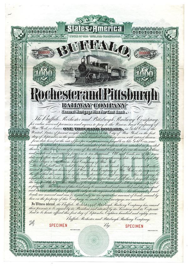 New York and Pennsylvania. $1000 Specimen 5% General Mortgage Coupon Bond, Black print on a large green border and under tint, Image of a passing locomotive at top, Specimen overprints, POC's, Fine-VF condition without any coupons and same minor splitting along fold lines. FBN, Unlisted Bond variety on Cox. Only 3 found, this is the last one available.