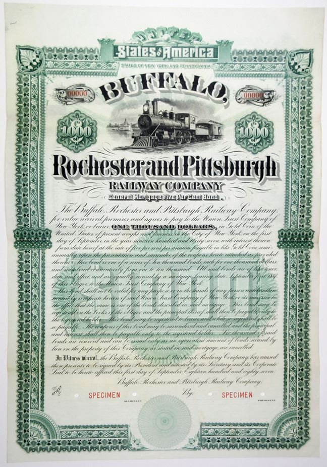 NY & PA, 1887. $1000 Specimen 5% General Mortgage Bond, Black text with ornate green border and undertint, Scene of train passing by at top. Red specimen overprints, 00000 serial numbers, POCs. VF condition. Only known as a specimen in Cox, no issued examples known. Only 3 examples found, this is the only example available.