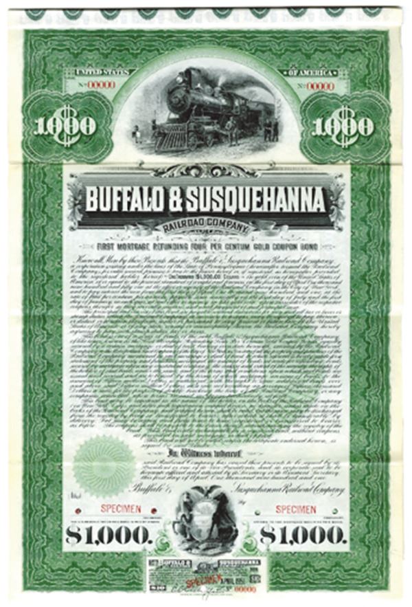 Pennsylvania. $1000 Specimen 4% 1st Mortgage Refunding Gold Coupon Bond, Black print on green border and under tint, Man standing by large locomotive at top, Specimen overprints and POC's, VF-XF condition, ABNC.