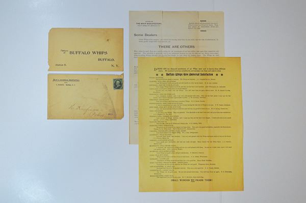 Two typeset pages of information on Buffalo Whips, along with mailing envelopes. (Whips for horses made in Buffalo, NY).