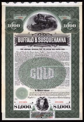 Pennsylvania, 1901, $1,000. 4% 1st Mortgage Refunding Gold Coupon Bond. Green border man standing in front of large locomotive on top and Arms of PA on bottom vignette. ABNCO. Specimen w/coupons, XF. Attractive and dynamic looking bond that is also very rare.