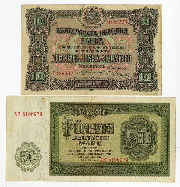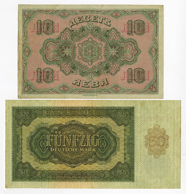 Pair of issued world notes, includes Bulgaria National Bank 10 Leva Zlatni, 1919, P-22, VF; and Germany Democratic Republic 50 Mark, 1948, P-13b, VF.