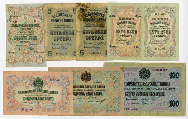 BulgariaÉ. Includes two 5 Leva Srebro, P-2b & P-2c, both F-VF; 10 Leva Srebro, P-3d, Ch.VF; 20 Leva Zlato, P-9, Fine with border tears; 50 Leva Zlato, P-10c, Ch. Fine; 100 Leva Zlato, P-11, VG; and two 5 Leva Srebro, P-16, both VG to Fine, one stained.
