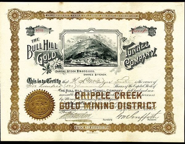 Colorado. 1896. 500 I/U Stock. #1058. Black print with gold border and underprint. Vignette of mine top center. VF condition. Denver Lith Co. Mine located in famous Cripple Creek Mining District.