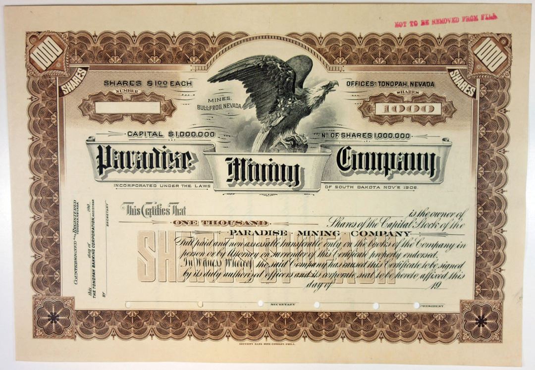Bullfrog, Nevada. (Inc. in South Dakota), ca.1900-20s. 1000 Shares Specimen Capital Stock Certificate, Black text with brown border and underprint, Eagle at top center. POCs, 'Not to be removed from file' stamp at top right, XF condition. The mines were located in the famous and popular Bullfrog Mining District. SBN.