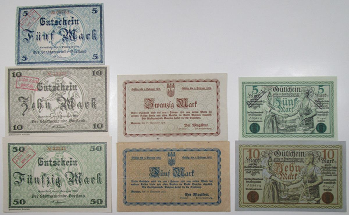 Germany. 1918, Lot includes 7 notes from Bunzlau a pair of 5 and 20 Mark Notgeld; from Rochlitz a pair of 5 and 10 Mark Notgeld featuring vignette of male and female laborers shaking hands; and from Rudolstadt a trio of 5, 10, and 50 Mark with rectangular handstamp. VF to Unc. (7)