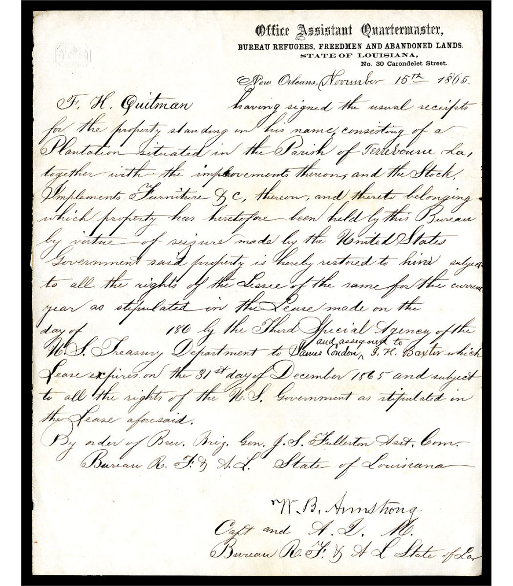 New Orleans, LA. November 15th, 1865, 1 page letter or Office of Assistant Quartermaster stationary. Letter is to F.H.Quitman from W.B. Armstrong, Captain and Assistant Quartermaster, discussing a plantation situated in the Parish of Terrebourne, LA, that evidently was seized by the U.S. Government after the war and appears to be leased or given back to him. Interesting and scarce post Civil War document. VF condition.