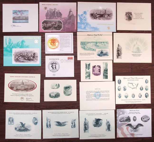 Arizona...., Florida, Maryland, Missouri, Pennsylvania, 1986-2008. Lot of 16 Souvenir Cards and 7 Informational Cards, Includes: Centennial Celebration of State of Liberty 1986, Official Centennial Seal; American Numismatic Association in Milwaukee, Wisconsin - August 1986, Reprint of Liberty Bell in brown; BEP Washington D.C., view of Cherry Blossoms and building; Midwest Flood Relief 1993 (Proceeds from Sale of the Card Benefited Victims of the 1993 Midwest Flood); Florida United Numismatists in Orlando, Florida - January 2003, Freedom and Liberty Souvenir Card; American Numismatic Association in Baltimore, Maryland - July/August 2003, "The Flag" Souvenir Card; National & World Paper Money Convention in St. Louis, Missouri - November 2003, "Patriotism" Souvenir Card; American Numismatic Association in Pittsburgh, Pennsylvania - August 2004, Lewis and Clark Bicentennial Westward Journey Souvenir Card; ANA National Money Show in Phoenix, Arizona - March 2008, Souvenir Card with Grand Canyon, Roosevelt Dam, Eagle with Spread Wings, and Coat of Arms for Arizona; Federal Managers Association Chapter 216, Souvenir Card with view of Capital Building in D.C.; Card with Goddess of Liberty vignette; American Heritage Collection Trio of Souvenir Cards in Blue, Green, and Pink; Pair of Cards with Nature and Landscape scenes. All are Gem Uncirculated. BEP. (23), Sold "AS IS" no returns accepted.