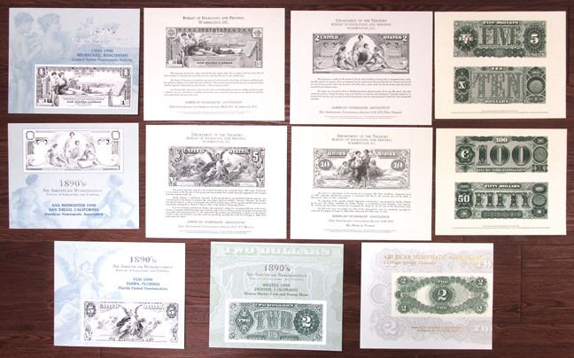 California....., Colorado, Florida, Georgia, Louisiana, Massachusetts, Tennessee, Washington D.C., Wisconsin, 1971-2001. Lot of 11 Souvenir Cards and 2 Informational Cards, Includes: American Numismatic Association 80th Anniversary Convention - August 1971, Washington D.C., $1 Silver Certificate of Series 1896; American Numismatic Association 81st Anniversary Convention - August 1972, New Orleans, Louisiana, $2 Silver Certificate of Series 1896; American Numismatic Association 82nd Anniversary Convention - August 1973, Boston, Massachusetts, $5 Silver Certificate of Series 1896; American Numismatic Association 83rd Anniversary Convention - August 1974, Bal Harbour, Florida, $10 Silver Certificate of Series 1896; American Numismatic Association Midwinter 1990, San Diego, California, Unfinished $2 Silver Certificate of "Educational Series" of 1896; Florida United Numismatists 1990, Tampa, Florida, $5 Silver Certificate from Unissued Series of 1897; Central States Numismatic Society 1990, Milwaukee, Wisconsin, $1 Silver Certificate from Unissued Series of 1897; Denver Westex Coin and Stamp Show 1990, Denver, Colorado, Reverse of $2 Treasury Note; American Numismatic Association - March 1993, Colorado Springs, Colorado, $2 Legal Tender Note; International Paper Money Show - June 2001, Memphis, Tennessee, $5 and $10 Back Treasury Notes; American Numismatic Association - August 2001, Atlanta, Georgia, $50 and $100 Back Treasury Notes. All are Gem Uncirculated. BEP. (13). Sold "AS IS" no returns accepted.