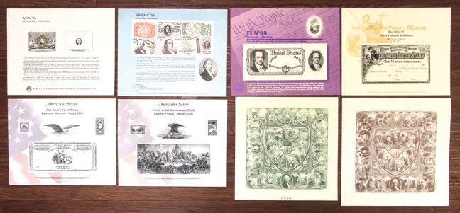 California....., Florida, Maryland, Missouri, Washington D.C., Wisconsin, 1986-2008. Lot of 7 Souvenir Cards, Includes: American Numismatic Assoc., '86, Milwaukee, Wisconsin, 5 Cent Fractional Currency Note; National World Paper Money Convention, '86, St. Louis, Missouri, Montage of Fractional Currency and Vignette of Samuel Dexter; Florida United Numismatists, '88, Orlando, Florida, 50 Cent Fractional Currency Note; 200th Anniversary of the Constitution Reverse Reprint of 2% Consol Bond; World Philatelic Exhibition, Pacific '97, San Francisco, California, IRS Enovated Butter Stamp Tax Certificate; ANA World's Fair of Money '08, Baltimore, Maryland, Americana Series with eagle, Snuff Stamp, Tobacco Stamp, and Cigar Stamp; Florida United Numismatists '08, Orlando, Florida, Eagle with Anchor, Everglades National Park Postage Stamp, Fruit Growing Parcel Post Stamp, De Soto Discovering the Mississippi. All are Gem Uncirculated. Printed by BEP. (7). Sold "AS IS" no returns accepted.