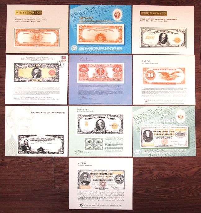 Arkansas, California, Colorado, Maryland, Michigan, Missouri, the Netherlands, New Jersey, Tennessee, 1981-96. Lot of 10 Souvenir Cards, Includes: International Paper Money Show, June 1981, Memphis, Tennessee, $20 Gold Certificate Series of 1905; ANA '84, Detroit, Michigan, $500 Gold Certificate Series of 1882; ANA '85, Baltimore, Maryland, $500 Gold Certificate (back) Series of 1882; LOBEX '86, Long Beach, California, $10 Gold Certificate Series of 1907 & Block of four 50 Cent Western Mining Prospector Stamps Series of 1898; IPMS '87, Memphis, Tennessee, $20 Gold Certificate (back) Series of 1922; GENA '87, Cherry Hill, New Jersey, $10 Gold Certificate (back) Series of 1907; ANA Midwinter '88, Little Rock, Arkansas, $10,000 Gold Certificate Series of 1882; European Paper Money Bourse, April 1994, Maastricht, Netherlands, $100 Gold Certificate Series of 1908 (Unissued); Central States Numismatic Association, April 1996, Kansas City, Missouri, $1000 Gold Certificate Series of 1907; American Numismatic Association, August 1996, Denver, Colorado, $1000 Gold Certificate (back) Series of 1907. Gem Uncirculated. (10). Sold "AS IS" no returns accepted.