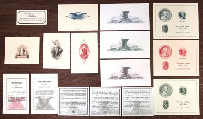California....., Tennessee, Texas, 1992-95. Lot of 10 Souvenir Cards and 6 Informational Cards, Includes: Trio of "Historic Voyage" Souvenir Cards with two vignettes of Columbus and Coat of Arms of Spain, Printed in Blue, Green, and Red; International Paper Money Show in Memphis Tennessee - June 1994 Vignette of Justice with scales held aloft; Florida United Numismatists in Orlando, Florida - January 1995, Vignette of proud and alert eagle in red; American Numismatic Association in Anaheim, California - August 1995, Vignette of eagle fiercely gripping flag in blue; Trio of American Bald Eagle vignettes boldly perched above shield with two ships in background printed in Blue, Gray, and Green; Vignette of Allegorical women - Agriculture, Commerce, & Industry. All are Gem Uncirculated. BEP. (16). Sold "AS IS" no returns accepted.