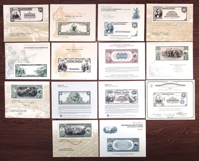 California...., Florida, Massachusetts, Michigan, New Jersey, Oregon, Tennessee, Texas, 1982-2005. Lot of 14 Souvenir Cards and 4 Informational Cards, Includes: International Paper Money Show Memphis, Tennessee, June 1982, $100 National Bank Note (back) Series of 1882; IPMC '85, Cherry Hill, New Jersey, $10 National Currency Note Series of 1883; IPMS '86, Memphis, Tennessee, $5 National Currency (back) Series of 1902; Bureau of Engraving and Printing 125th Anniversary 1987, Fort Worth, Texas, $5 National Banknote Series of 1904; American Numismatic Association, 1992, Orlando Florida, $5 National Banknote (back) Series of 1875; American Numismatic Association, July 1994, Detroit, Michigan, $10 Federal Reserve Note (back) Series of 1915; Bay State Coin Show, April 1997, Boston, Massachusetts, $20 National Bank Note Series of 1882; International Paper Money Show, June 1997, Memphis, Tennessee, $10 National Bank Note (back) Series of 1902; Florida United Numismatists, January 1998, Orlando, Florida, $10 National Currency (back); International Paper Money Show, June 1998, Memphis, Tennessee, $100 National Bank Note (back); American Numismatic Association, August 1998, Portland, Oregon, $50 National Currency Series of 1902; LOBEX '98, Long Beach, California, $10 National Currency Series of 1902; Florida United Numismatists, January 2005, Fort Lauderdale, Florida, $50 National Currency Series of1902 and Ponce de Leon Vignette; ANA World's Fair of Money, July 2005, San Francisco, California, $10 National Currency (back) Series of 1882 and vignette from Yosemite National Park. Informational cards are from IPMS Special print referring to three allegorical figures together; BEP waiver of rights to map of Los Angeles, 1873; Explanation of souvenir cards from FUN Show Jan 2005 and ANA Show July 2005. All are Gem Uncirculated. BEP. (18). Sold "AS IS" no returns accepted.
