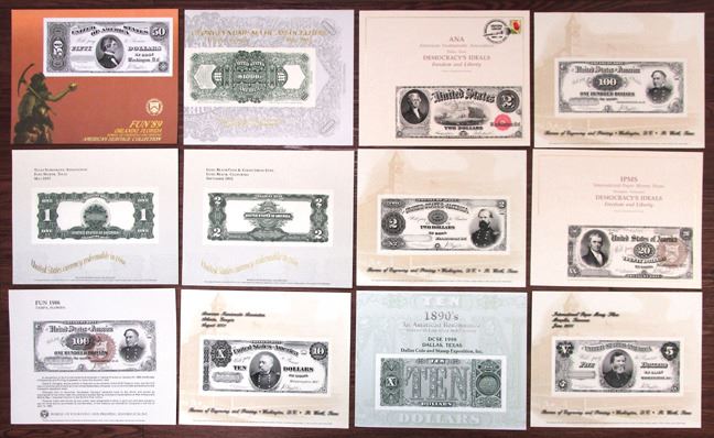 California, Florida, Georgia, Tennessee, Texas, 1986-2002. Lot of 12 Souvenir Cards and 1 Informational Card, Includes: Florida United Numismatists, January 1986, Tampa, Florida, $100 Treasury Note Series of 1890; Florida United Numismatists '89, Orlando, Florida, $50 Treasury Note Series of 1891; Dallas Coin and Stamp Expo 1990, Dallas, Texas, $10 Treasury Note. (12). Sold "AS IS" no returns accepted.