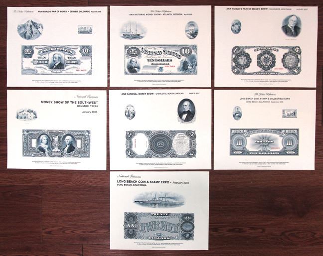 California......., Colorado, Georgia, North Carolina, Texas, Wisconsin, 2005-07. Lor of 7 Souvenir Cards and 6 Informational Cards, Includes: Money Show of the Southwest, January 20005, Houston, Texas, $1 Silver Certificate Series of 1890 and Vignette of the Alamo; Long Beach Coin & Stamp Expo, February 2005, Long Beach, California, $20Treasury Note (back) Series of 1890 and engraving of Battleship California; ANA National Money Show, April 2006, Atlanta, Georgia, $10 United States Note Series of 1880 and Vignettes of SS Savannah and Georgia State Shield; ANA Word's Fair of Money, August 2006, Denver, Colorado, $10 United States Note Series of 1908 and Vignettes of the Mount of the Holy Cross and Colorado Statehood 75th Anniversary Postage Stamp; LOBEX '06, Long Beach, California, $10 United States Note Series of 1923 and Vignette of California State Shield and 3 Cent California Statehood Commemorative Postage Stamp; ANA National Money Show, March 2007, Charlotte, North Carolina, $5 United States Note (back), Series of 1880 with North Carolina State Shield and Portrait of James K. Polk; ANA World's Fair of Money Show, August 2007, Milwaukee, Wisconsin, $5 Treasury Note Series of 1891, Wisconsin Sate Shield and Portrait of William H. Rehnquist. All are Gem Uncirculated. BEP. (13). Sold "AS IS" no returns accepted.