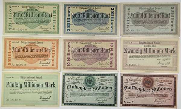 Germany. Lot of 9 inflationary Notgeld, issued in August 1923, includes 500 Million Mark; 100 Million Mark; 50 Million Mark; 20 Million Mark; 10 Million Mark; 5 Million Mark; 2 Million Mark; and 1 Million Mark. All uniface, About to Choice Unc. Also included a second 5 Million Mark by the same issuer but from an earlier 1923 issue, Fine to VF. (9)