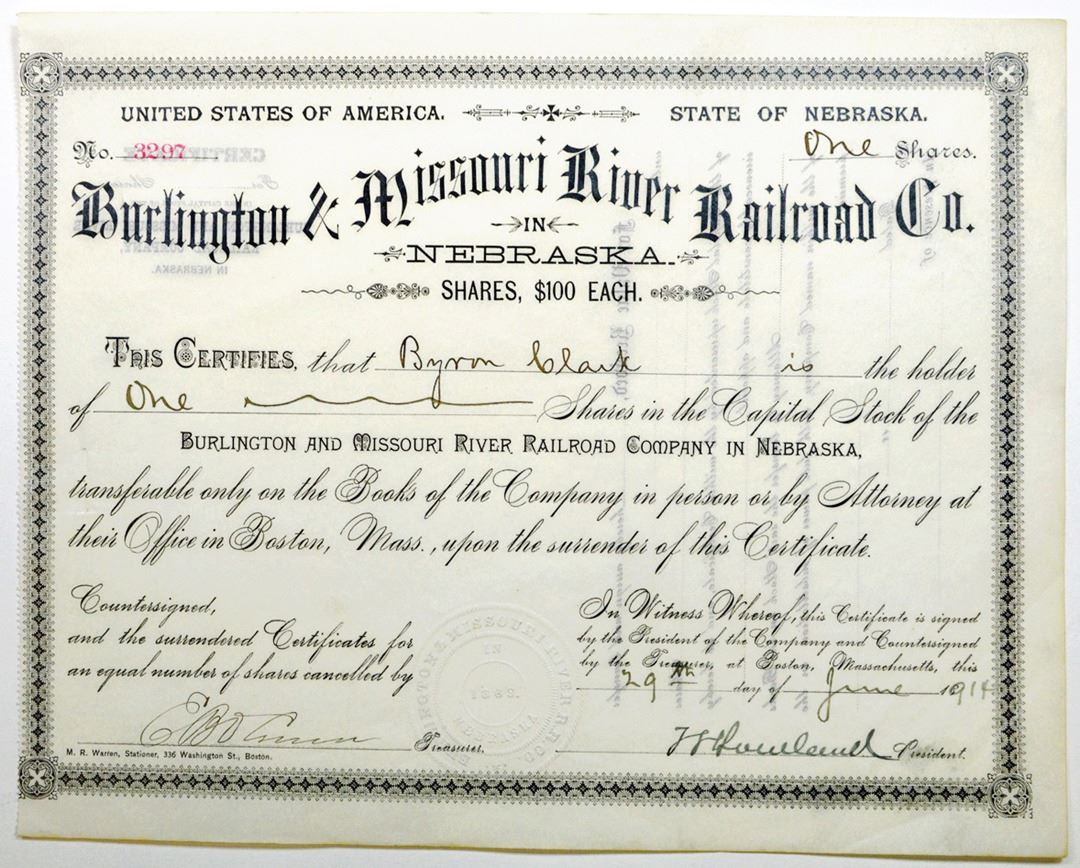 Nebraska. 1 Shrs Stock Certificate. I/U. Very Fine +