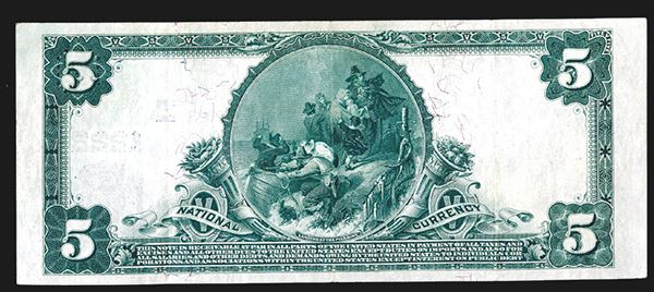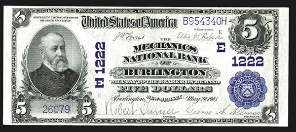 Burlington, NJ. 1905, The Mechanics National Bank of Burlington, NJ. Ch# 1222, $5.00, FR. 598.