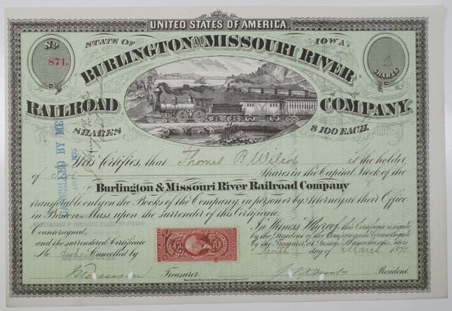 Iowa, 1871. 2 Shares I/C Capital Stock Certificate, Black text with black border and green background, Profile of a train passing at top center. Cancelled stamp at left, POCs. Fine-VF condition.