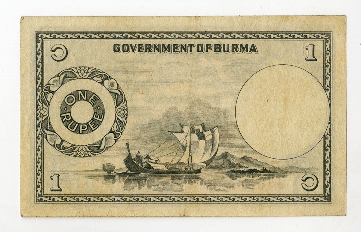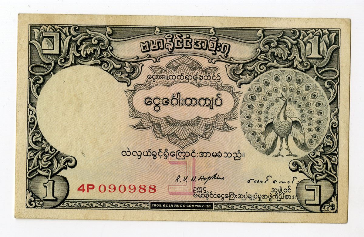 Burma, ND (1948). 1 Rupee, P-34, Issued Banknote, Gray with light green and pink underprint and Peacock at right, S/N 4P 090988, XF to AU condition, TDLR.