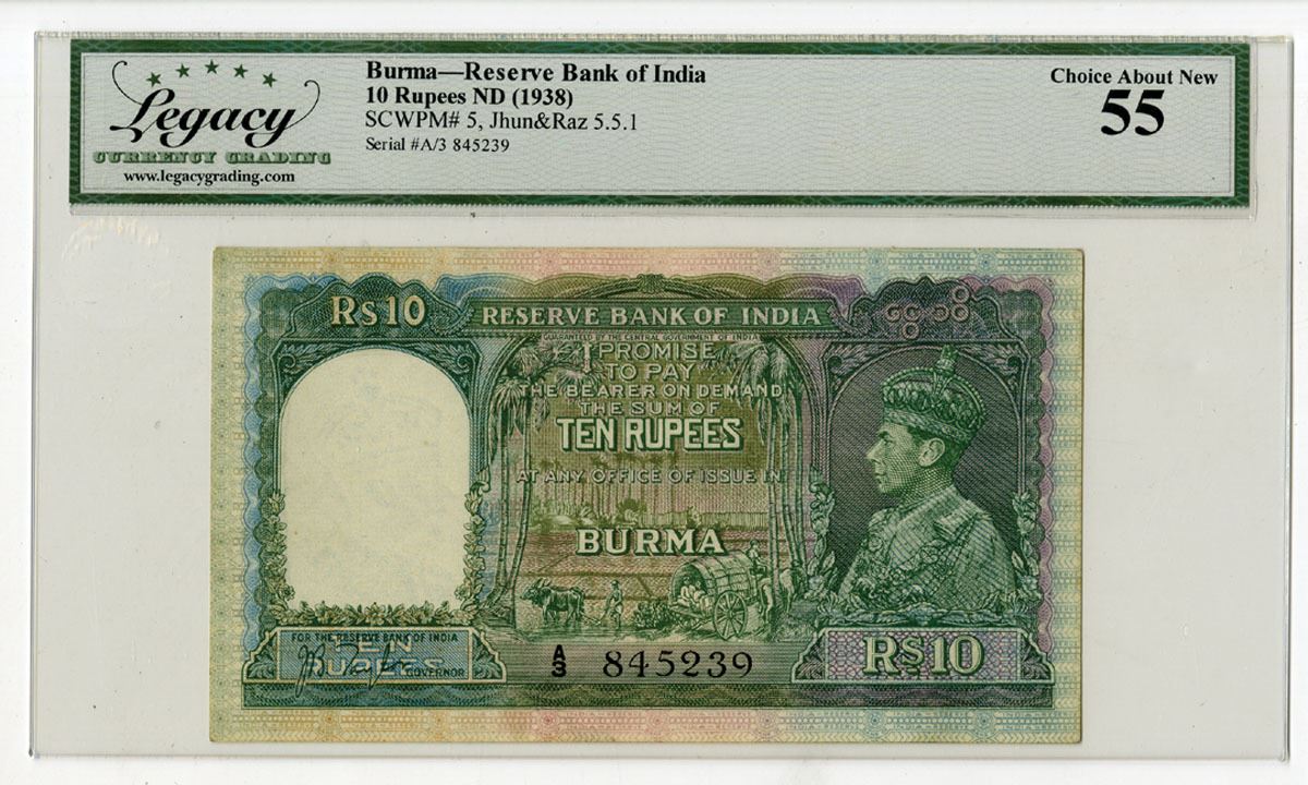 Burma, ND (1938).. 10 Rupees, P-5 Jhun&Raz 5.5.1, Issued Banknote, Green and m/c print with portrait of King George VI at right and ox plow with cart at center, Back is green on orange and blue with Dhow at center, S/N A/3 845239, Legacy graded Choice About New 55 with comment "Staple Holes at Left as Issued."