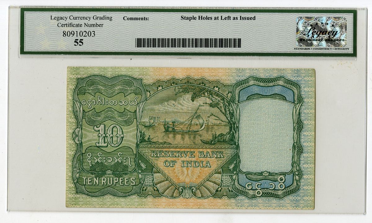 Burma, ND (1938).. 10 Rupees, P-5 Jhun&Raz 5.5.1, Issued Banknote, Green and m/c print with portrait of King George VI at right and ox plow with cart at center, Back is green on orange and blue with Dhow at center, S/N A/3 845239, Legacy graded Choice About New 55 with comment "Staple Holes at Left as Issued."