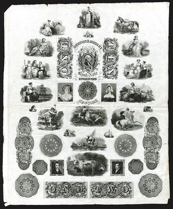 New York, 11.25 by 13.5 inches, black on india paper, 24 vignettes of notable people, allegorical women, men, horses, navigation as well as counters and counterfoils, Choice Fine to VF condition. Rare sheet rarely seen in any form and offered by us for the first time. B&G.