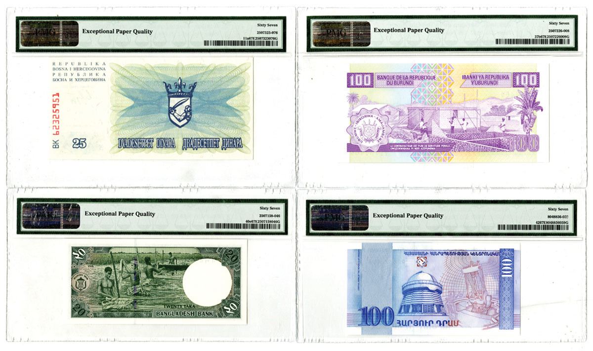 Burundi, Bangladesh, Armenia, Bosnia & Herzegovina, 1992 to 2006. Lot of 4 Issued Banknotes, Includes: Central Bank of Armenia 100 Dram, P-42, PMG Superb Gem Unc 67 EPQ; Bangladesh Bank 20 Taka, P-40e, PMG Superb Gem Unc 67 EPQ and possibly one of the highest graded, but this is the highest graded example to be offered at auction; Bosnia & Herzegovina National Bank 25 Dinara, P-11a, PMG Superb Gem Unc 67 EPQ; Banque de la Republique du Burundi 100 Francs, P-37b, PMG Superb Gem Unc 67 EPQ. (4). Sold "AS IS" no returns accepted.