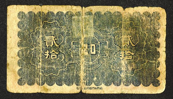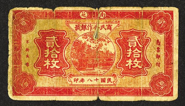 China, 20 Yuan, P-Unlisted, orange-red on light green, house in middle, VG with repairs on back.
