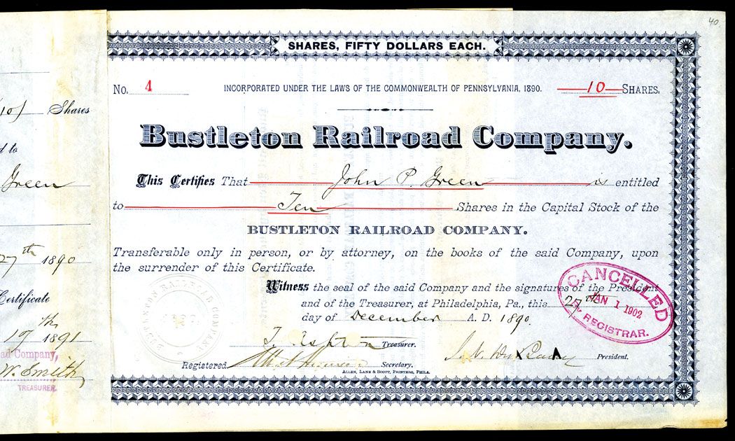 Pennsylvania, 1890, 10 Shares I/C, no vignette, counterfoil on left, VF.