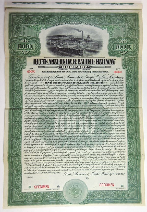 Montana, 1914, $1000, 1st Mortgage, 5% Gold Coupon Bond, Specimen bond, Electric ore train with mine in back ground, Green, Specimen overprints, POC's, VF condition with an archivally reinforced horizontal fold, ABNC. Rare bond in any format and rare as a specimen.