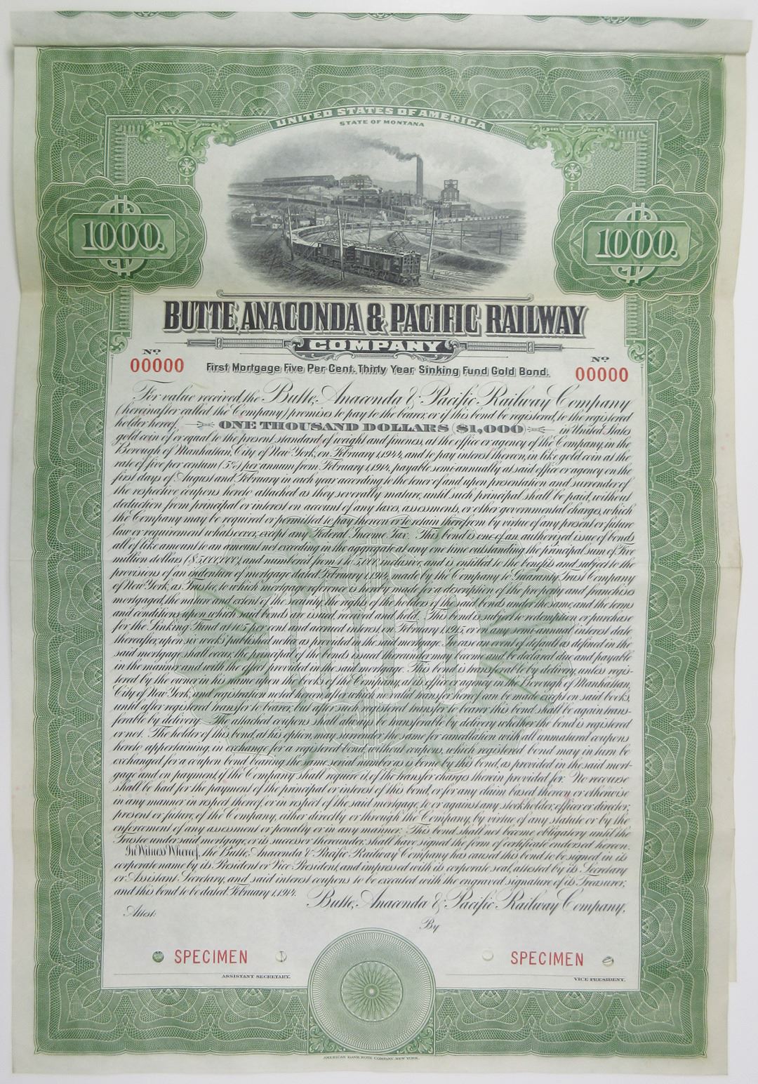 Montana. $1,000 Specimen 5% First Mortgage Thirty Year Sinking Fund Gold Coupon Bond, Black print on green border and under print, Locomotive rounding corner at top, Specimen overprints and POC's, VF-XF condition, ABNC. Rare bond only known as a specimen in Cox, no issued examples known.