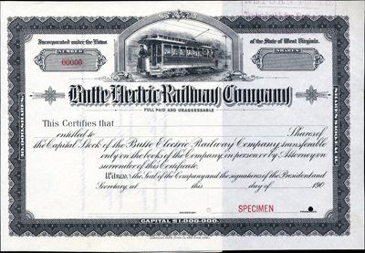 190-. Odd Shs. Specimen stock certificate. Red "Specimen" overprints, "00000" serial numbers and POC's. Electric street car. Capital stock. Appears in XF condition. Rare certificate. ABNC.