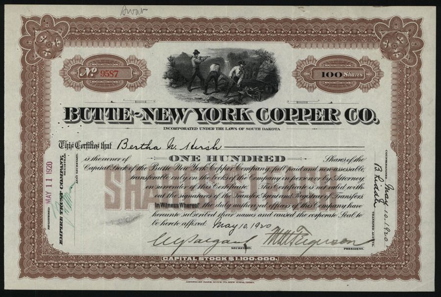 South Dakota, 1920, Issued and Uncancelled Stock, 100 Shares, #9587, Black on brown border and underprint, Mining vignette top center, VF condition, ABNC.