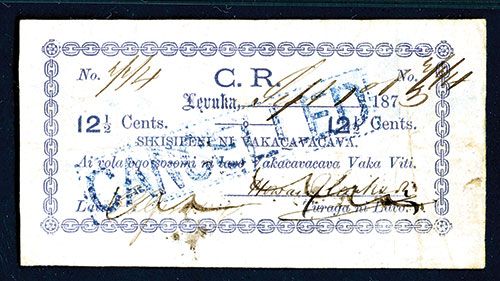 Levuka, Fiji, 187x (1873), 12 1/2 cents, P-7b, Issued and cancelled, Single chain, dark blue on light grey paper, blue cancelled overprint and ink cancelled, S/N 774, PMG graded Very Fine 30, Crisp VF condition with claims to Choice VF, fresh appearance, strong ink colors, firm paper and sharp corners only enhance this rare note. Rarely seen this nice and will enhance any Fiji collection. Printed at the Gazette office Levuka. Ovalau, Fiji. This is the only example graded by PMG.