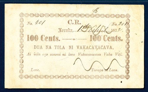 Levuka, Fiji, 187x (1873), 1st April 1873, 100 cents, P-12r, Partially issued and ink cancelled, Single chain, Brown with C.R. on top, S/N 201, Strictly PMG graded Choice Very Fine 35, the note appears XF at first glance, fresh appearance, strong ink colors, firm paper and sharp corners only enhance this rare note. Rarely seen this nice and will be difficult to improve upon. Printed at the Gazette office Levuka. Ovalau, Fiji. This is the only example graded by PMG.