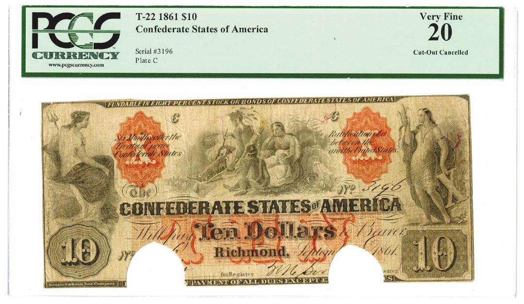 Richmond, VA. September 1861. $10, T-22, Issued banknote, S/N 3196 Plate C, PCGS graded VF 20. Cut-Out Cancelled. Southern Bank Note Co.