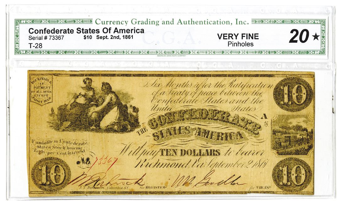 Richmond, VA. September 2nd, 1861. $10, T-28, Issued banknote, S/N 73367, CGA graded Very Fine 20. Pinholes.
