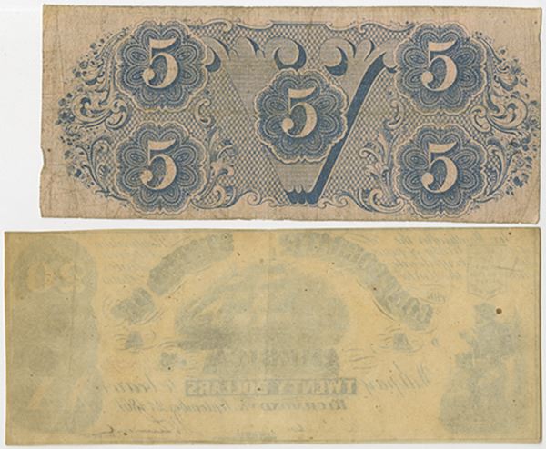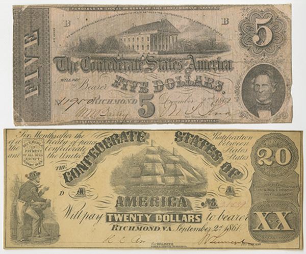 Richmond, VA. Lot of 2 notes, Includes 1861, $20, P-31b, Ch.VF-XF; and 1862, $5, Jefferson Davis, Pink paper, Fine condition.