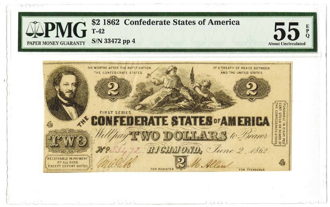 Richmond, VA. June 2nd, 1862. $2, T-41, Issued banknote, S/N 33472 pp 4, PMG graded About Unc 55 EPQ.
