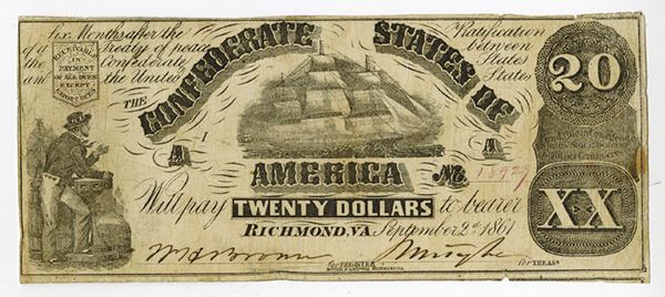 Richmond, VA. $20 Issued, Black with no underprint, Punch cancelled, Fine/VF with stain on right. S/N 18929, Plate A1.