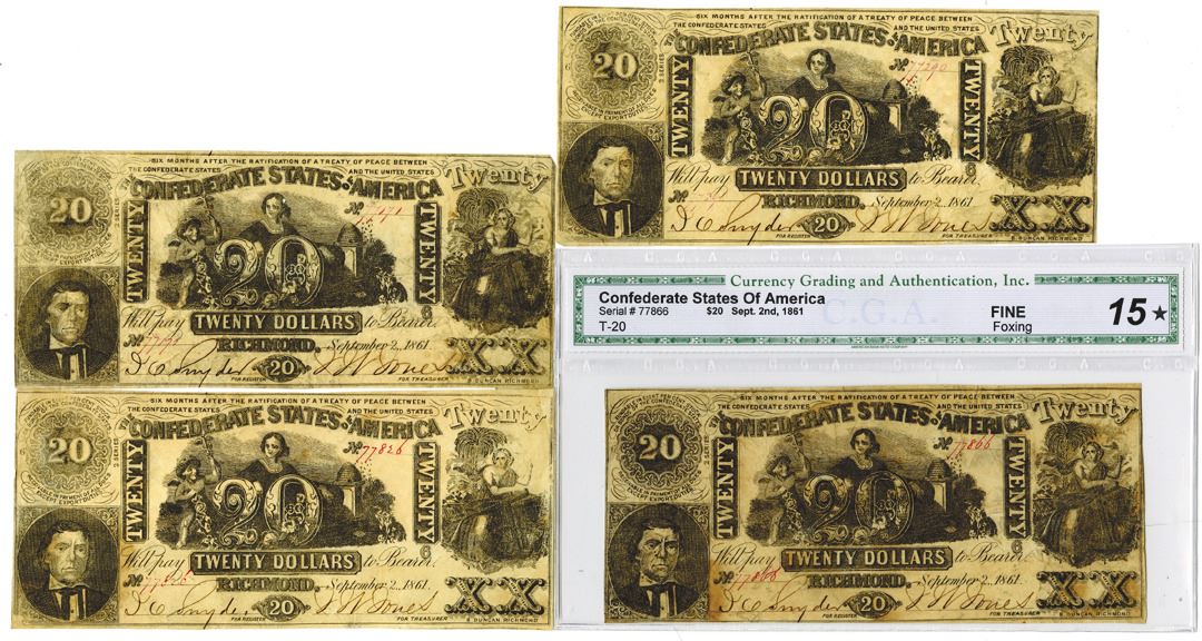 Richmond, Virginia. Lot of 4 notes, all are Sept. 2nd, 1861, $20, T-20, Issued Banknotes, S/Ns 77171; 77826; and 77290, all in Very Good condition. One is Sept. 2nd, 1861, $20, T-20, Issued Banknote, S/N 77866, CGA graded Fine 15, with foxing. (4) (Sold "AS IS", No returns accepted)