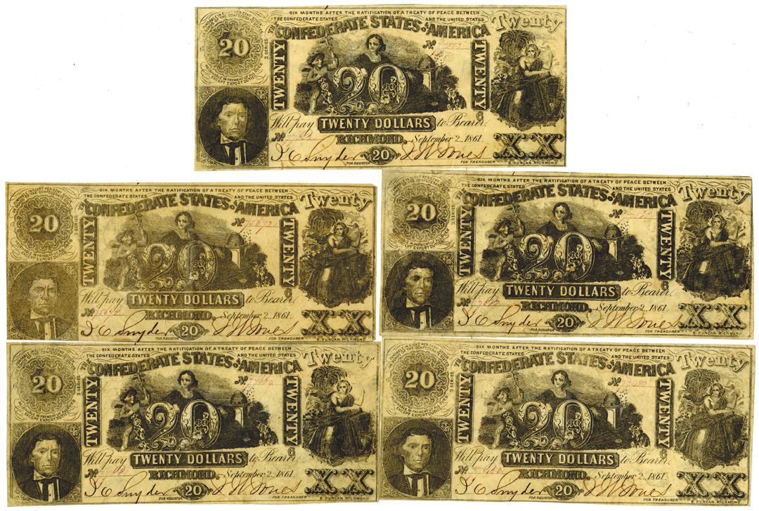 Richmond, Virginia. Lot of 5 notes, all are Sept. 2nd, 1861, $20, T-20, Issued Banknotes, S/Ns 77352; 75672; 77512; 77669; and 77480. Notes feature an allegorical woman and cherub at center. (5) (Sold "AS IS", No returns accepted)