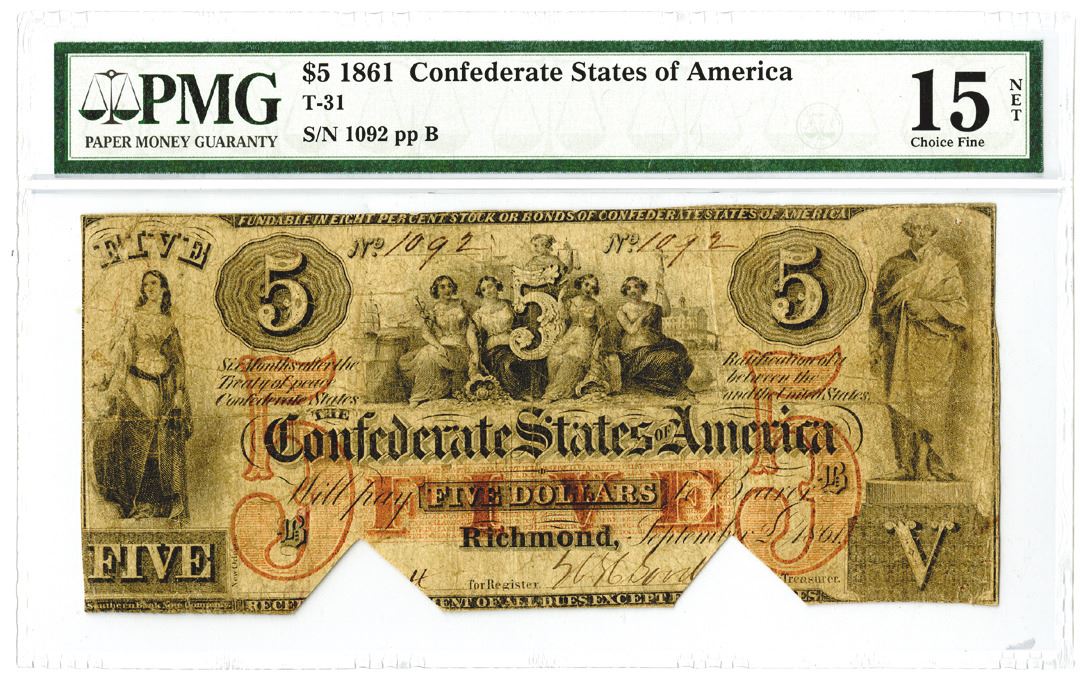 Richmond, VA. September 2nd, 1861. $5, T-31, Issued banknote, S/N 1092 pp B, PMG graded Choice Fine 15 Net. Cut-Out Cancelled, Minor Rust. Southern Bank Note Co.