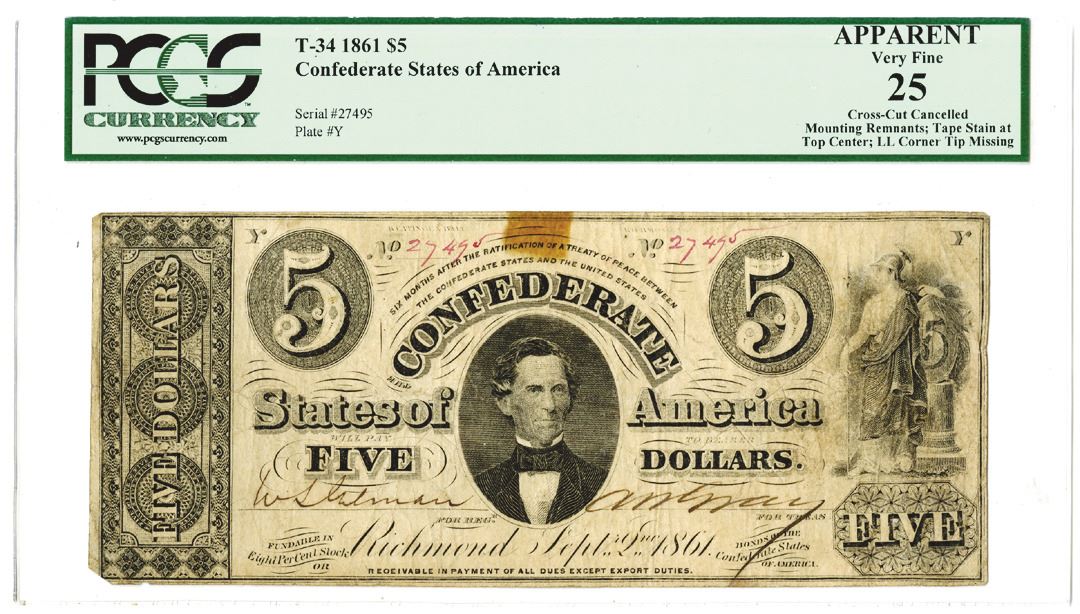 Richmond, VA. September 2nd, 1861. $5, T-34, Issued banknote, S/N 27495 Plate #Y, PCGS graded Very Fine 25. Cross-Cut Cancelled, Mounting remnants, Tape stain at top center, LL corner tip missing. K&B.