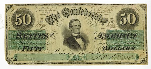 Richmond, VA. $50 Issued, Black on green underprint, Uncancelled, VF with the lower left corner tip missing. S/N 30390, Plate WA-AW, red fiber paper. Attractive note.