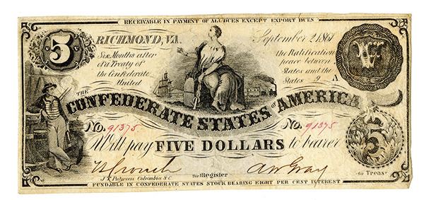 Richmond, VA. Issued 5 Dollars, 09.02.1861, Fricke Type 36, Series A, pleasing Very Fine condition. J.T. Paterson. Columbia, S.C.