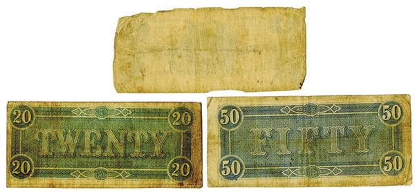 Richmond, Virginia. Lot of 3 notes, Includes 1861, $5, T-36, CC, VG; 1864, $20 and $50, both VF, the $50 has a low S/N 1402.