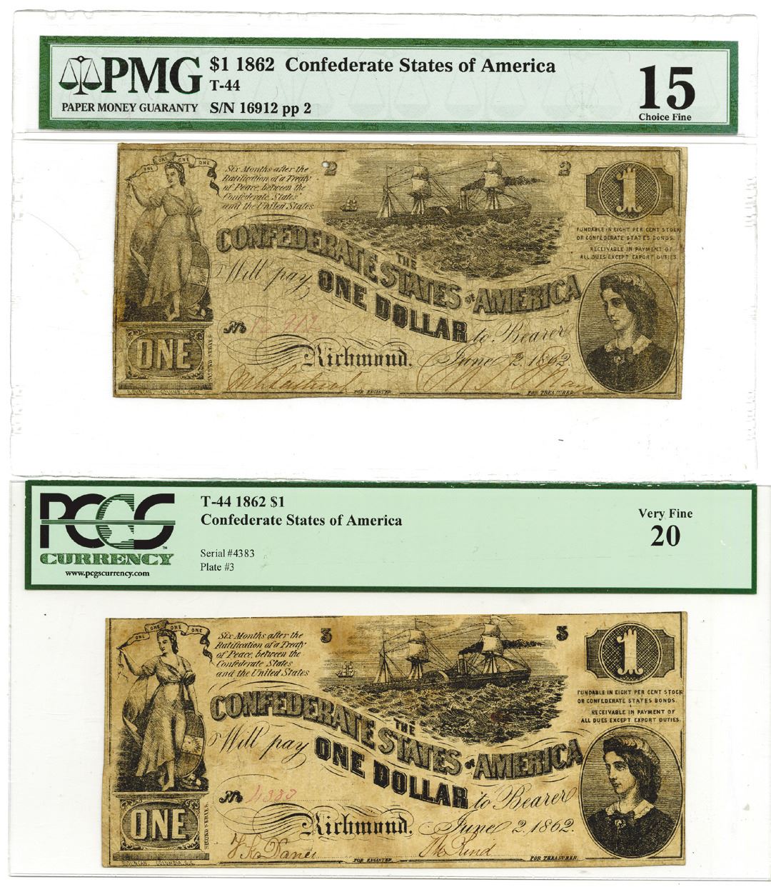 Richmond, VA. Lot of 2 notes. Includes June 2nd, 1862. $1, T-44, Issued banknote, S/N 16912 pp 2, PMG graded Choice Fine 15; and, June 2nd, 1862. $1, T-44, Issued banknote, S/N 4383 Plate #3, PCGS graded Very Fine 20. (2)
